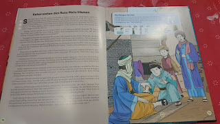 Sambil terkantuk-kantuk saya panggil Al untuk meriew bukunya. Ceritanya sendiri sudah beres dibaca saat ditemani Abinya kemarin.